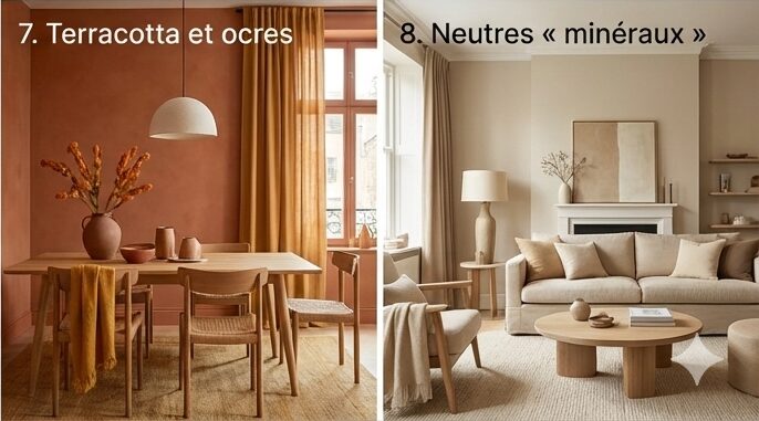 Les tons terreux comme le terracotta, argile ou ocre reviennent en force. Ils réchauffent les espaces et s’accordent idéalement avec des textures naturelles comme le lin, le bois ou la terre cuite.